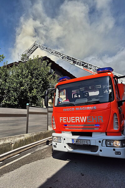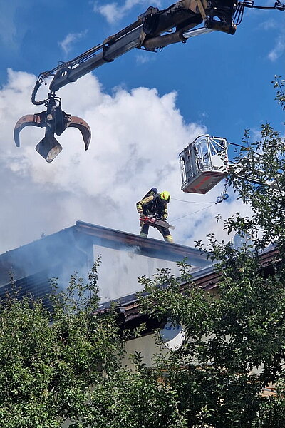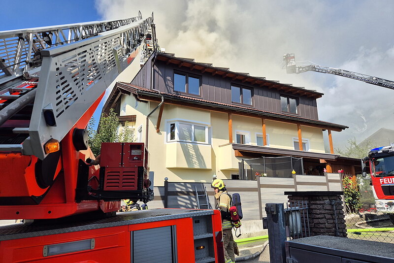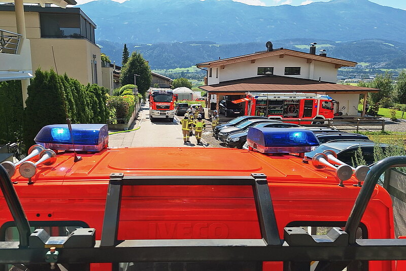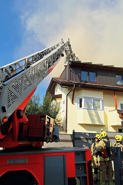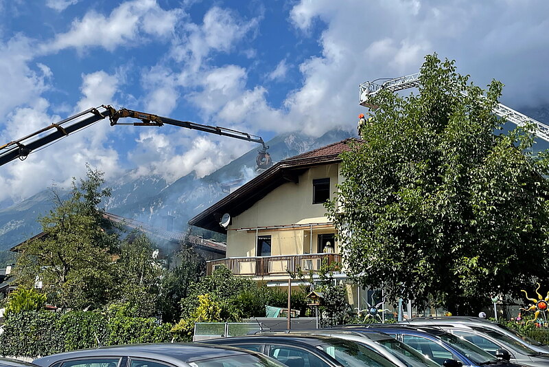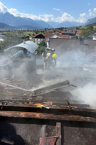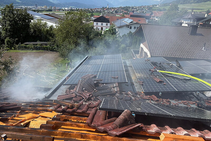 Beim Eintreffen der Haller Mannschaft waren die Ortsfeuerwehr aus Thaur sowie die Feuerwehr Rum mittels Drehleiter bereits vor Ort. Gemeinsam konnte das Feuer rasch unter Kontrolle gebracht werden. Auf Grund der Bauweise und einer Photovoltaik-Anlage am Dach zogen sich die Nachlöscharbeiten in die Länge. Um an Glutnester zu kommen, musste teilweise die Photovoltaikpaneele entfernt und die Dachkonstruktion geöffnet werden.