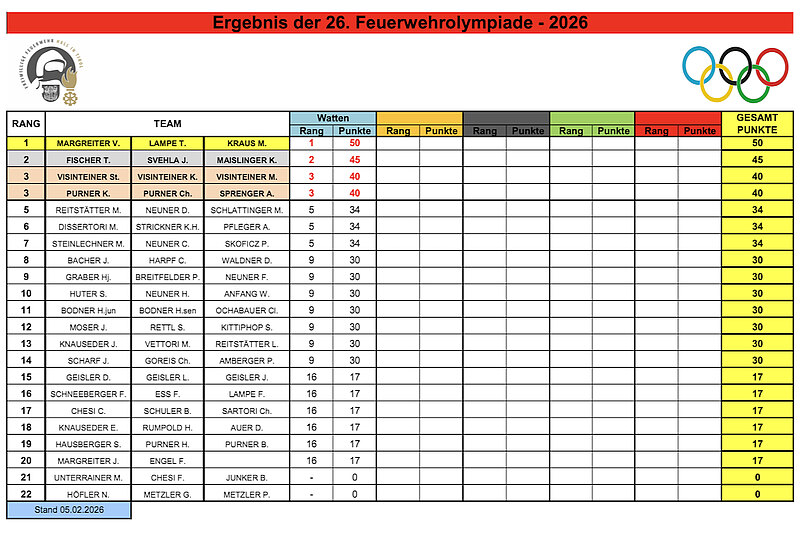 Gestartet wurde mit der altbewährten Disziplin „Watten“, welche seit der Entstehung der Olympiade – vor allem in den ersten Jahren – ein fixer jährlicher Bewerb war. In einer Auslosung wurden die einzelnen Teams für das K.-o.-System gezogen. Dabei hatten sogar ein bis zwei Teams das Glück auf ein Freilos. Nach guten fünf Stunden und zahlreichen spannenden Spielen stand schließlich das Siegerteam der ersten Disziplin fest: Margreiter Victoria, Lampe Thomas und Kraus Markus.